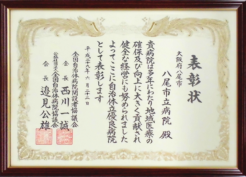 八尾市立病院が平成29年度自治体立優良病院表彰を受賞しました。