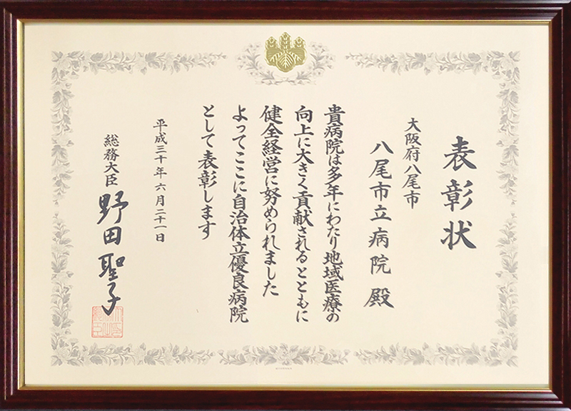 八尾市立病院が平成30年度自治体立優良病院表彰(総務大臣表彰)を受賞しました。