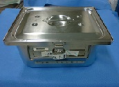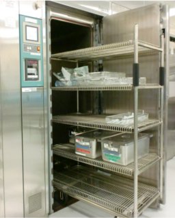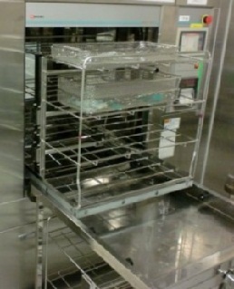 - ▼器材を専用カートに載せて滅菌機の中へ