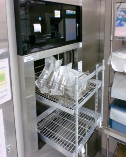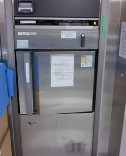 回転するプロペラから勢い良く噴出した洗浄水で、使用した器材に附着した汚染物を洗浄・消毒する機械で、熱水処理や超音波洗浄、また乾燥工程もあり器材の消毒効果があります。