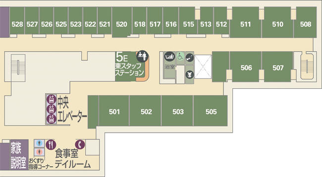 | 5階東病棟 | 内科(呼吸器、糖尿、一般)、外科、脳神経外科 |