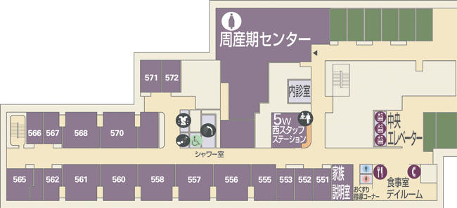 | 5階東 | 5階西 | 病棟(産婦人科、内科(呼吸器・糖尿・一般)、外科、脳外科、救急) 分娩室、家族説明室、お薬指導室 など |