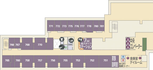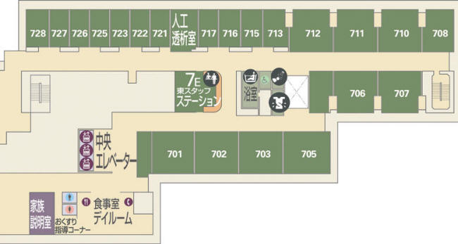 | 7階東 | 7階西 | 病棟(血液内科、循環器内科、泌尿器科、口腔外科、皮膚科、形成外科、眼科) 人工透析室、家族説明室、お薬指導室 など |