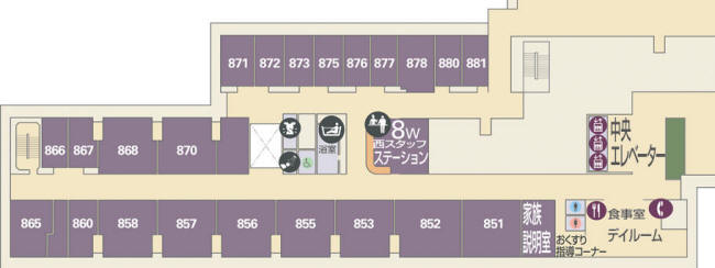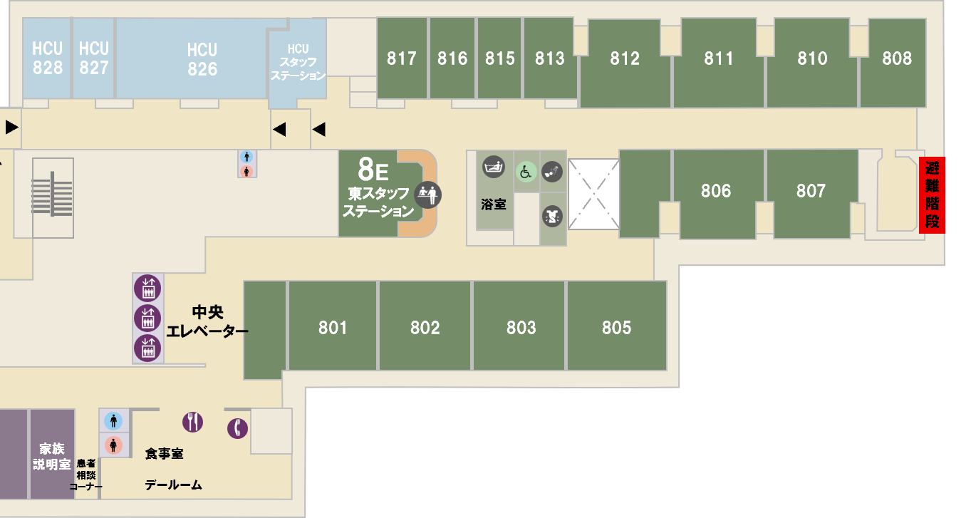 | 8階東 | 8階西 | 病棟(消化器内科、外科)、高度治療部(HCU) 家族説明室、お薬指導室 など |