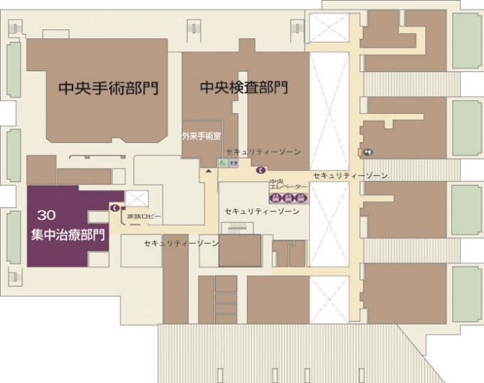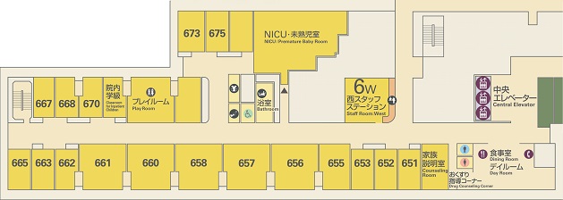 | 6階東 | 6階西 | 病棟(小児科、耳鼻咽喉科、整形外科)、新生児集中治療部(NICU) 耳鼻科治療室、院内学級、家族説明室、お薬指導室 など |