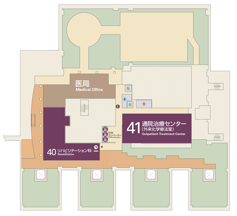 | 1階 | 救急部門、放射線治療・核医学、物品管理センター、薬剤部門、地域医療連携センター、 栄養部門、MEセンター、駐輪場など |