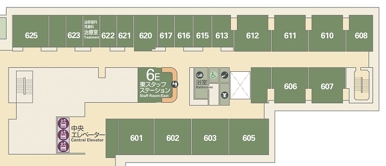 | 6階東病棟 | 耳鼻咽喉科、整形外科 |