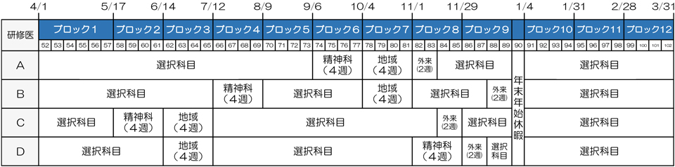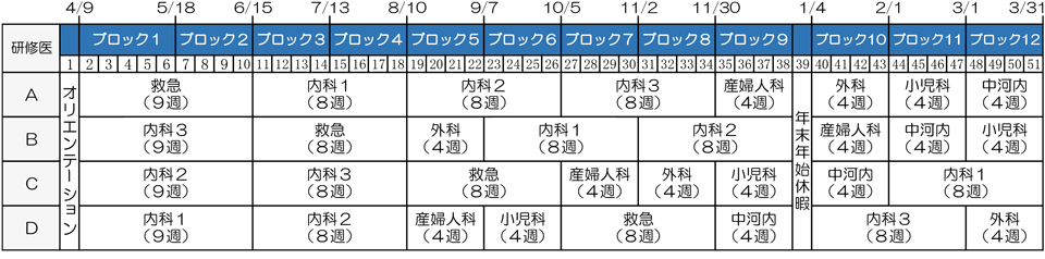 必修化科目は内科、救急、外科、小児科、産婦人科、地域医療、精神科及び一般外来です。またこれらの他に内科・血液内科・消化器内科・循環器内科・外科・乳腺外科・脳神経外科・麻酔科・産婦人科・小児科・整形外科・耳鼻咽喉科・形成外科・泌尿器科・放射線科・病理診断科・臨床検査科から選択科目を選択することができます。